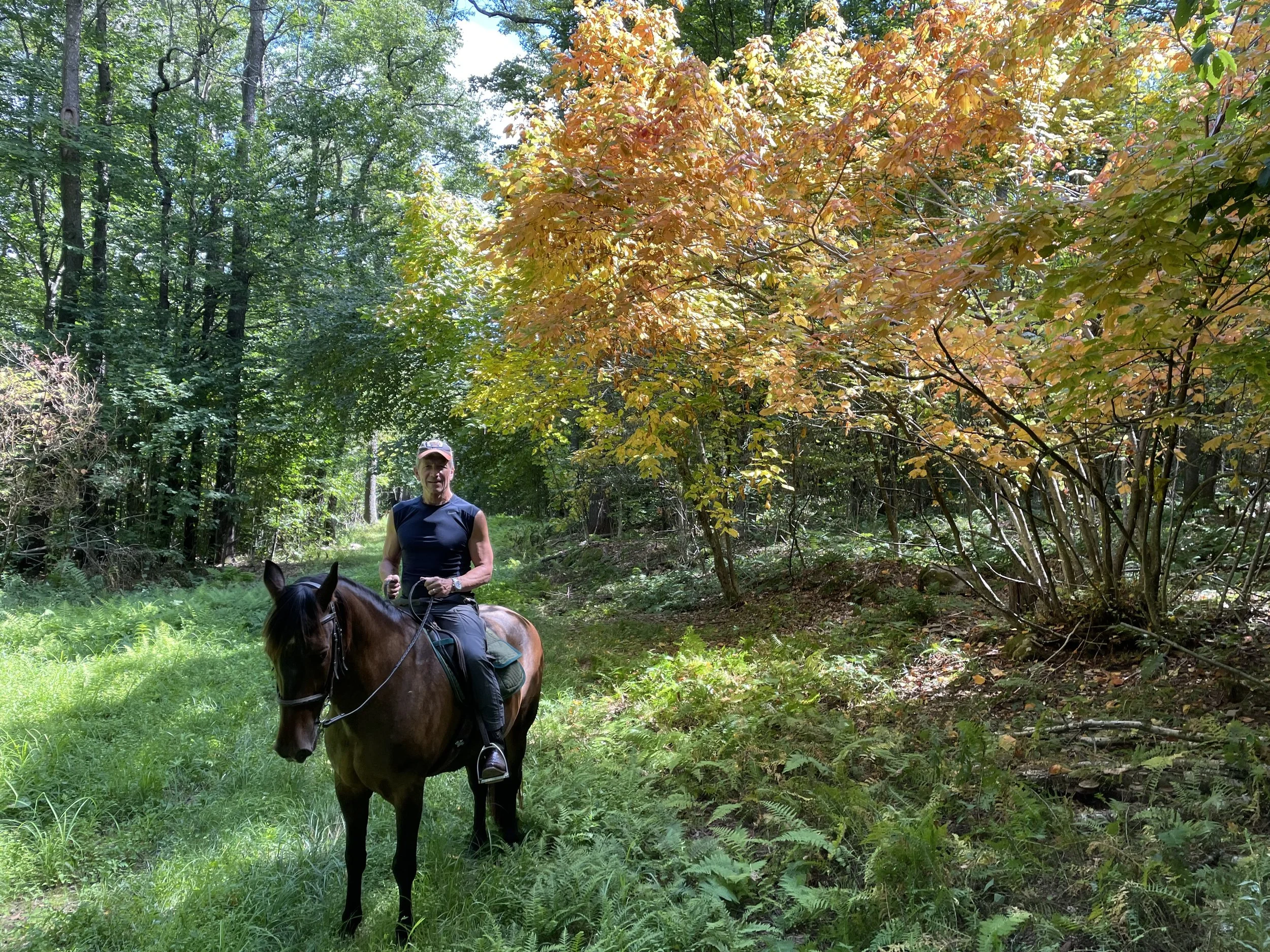 We saddled up and got going. No shitting, 10 yards into the forest, we hit our first ‘goosekiller.’ Juneau attacked it with gusto but petered out to a walk not even half-way up. Huffing and puffing we got to the top, walked around a bend, and there it was – goosekiller number two. And, so it went for about 90 minutes that gained us probably about 1,000 feet of elevation. You may ask why -- why keep going up that crap? Let’s start with the fact that this was one of the most beautiful forests I’ve seen in years. Lots of maples mixed with big hemlocks. The ground covered with wispy grass and ferns. And, then there’s this thing about being a wanderer – every time you see a bend in the trail, you wonder what’s around it. And what we saw at the top of this climb is that in the Catskills, late August is the start of autumn.